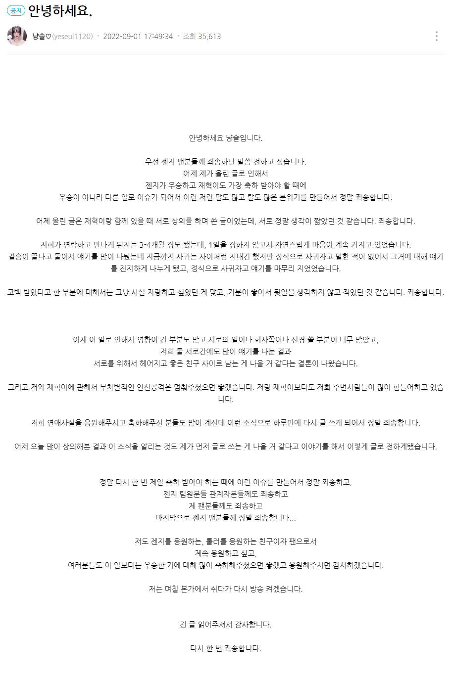 아무래도 팬이 많은 룰러 선수나 냥슬님의 팬 중에서 공개연애를 안 좋게 보시는 분들이 많았나봅니다.