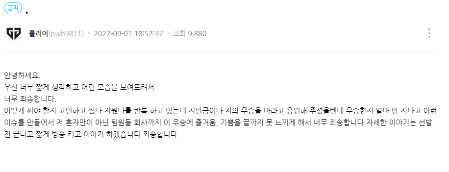 안녕하세요 냥슬입니다. 우선 젠지 팬분들께 죄송하단 말씀 전하고 싶습니다.어제 제가 올린 글로 인해서젠지가 우승하고 재혁이도 가장 축하 받아야 할 때에우승이 아니