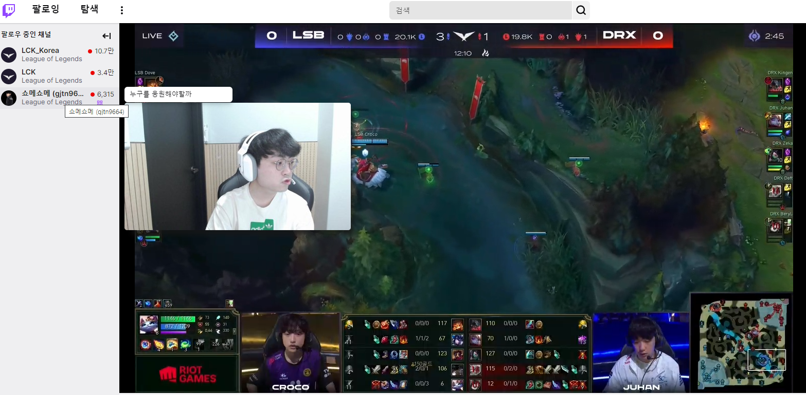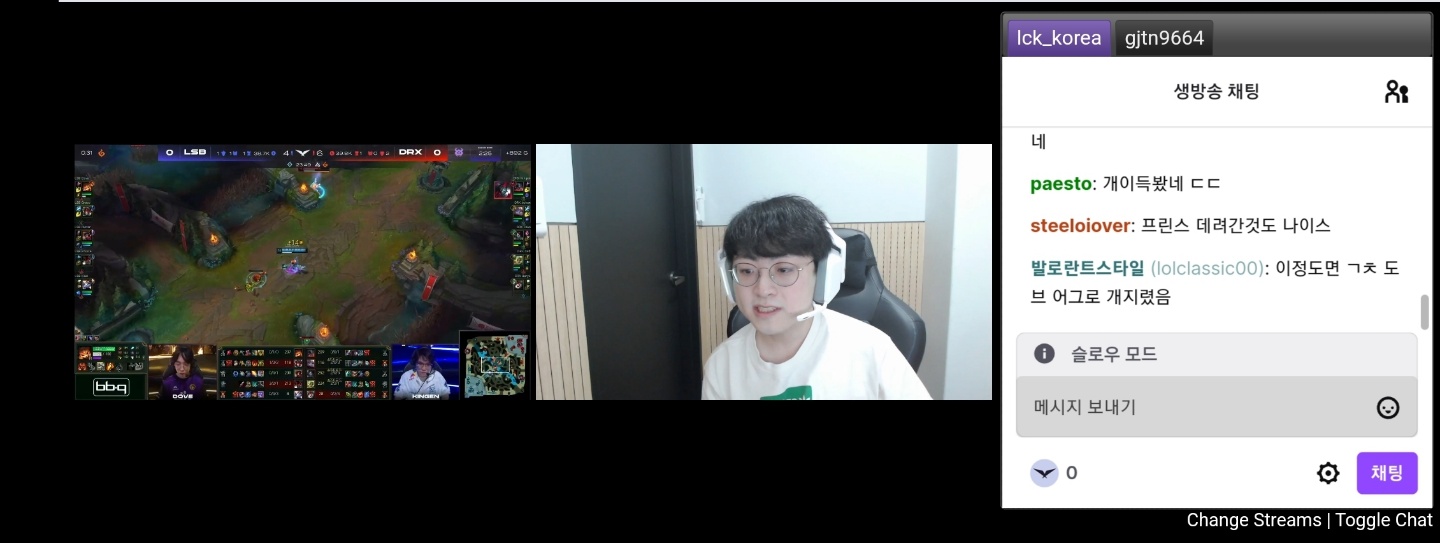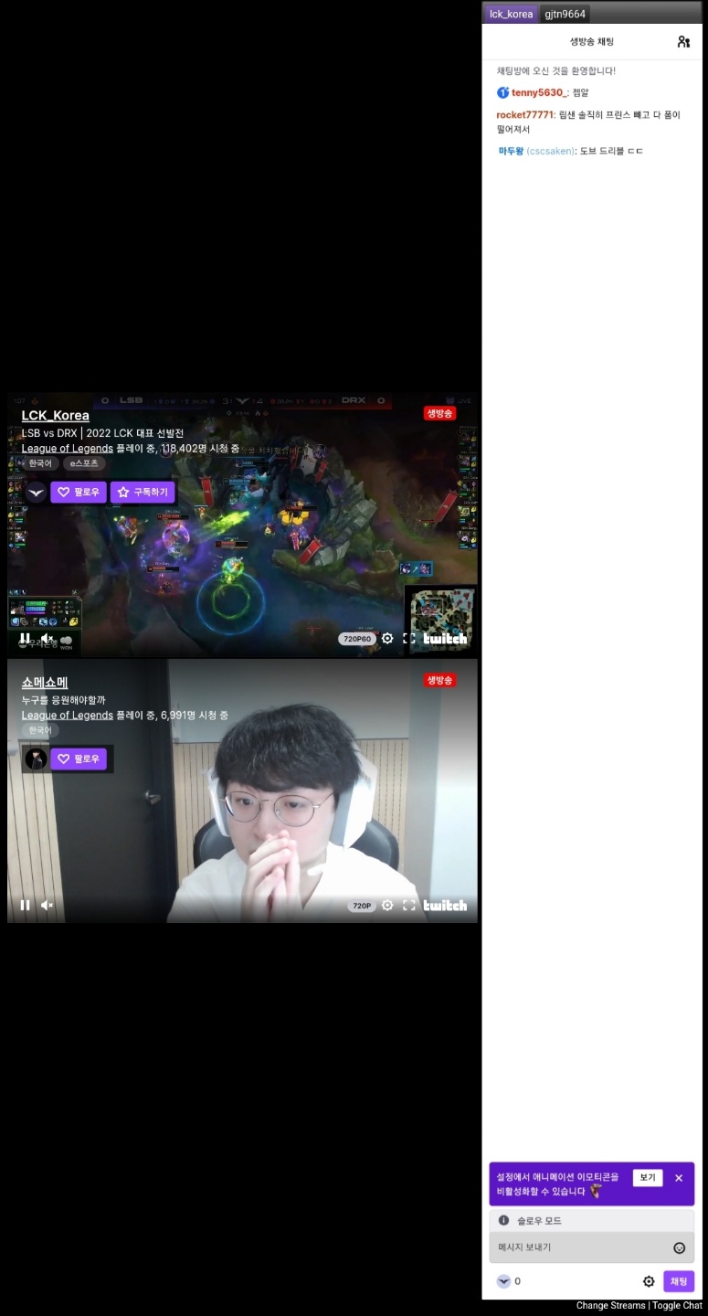 트위치 어플로 팝업모드를 하고 크롬으로 메인 LCK 화면을 띄우면 동일한 모습을 만들 수 있습니다.